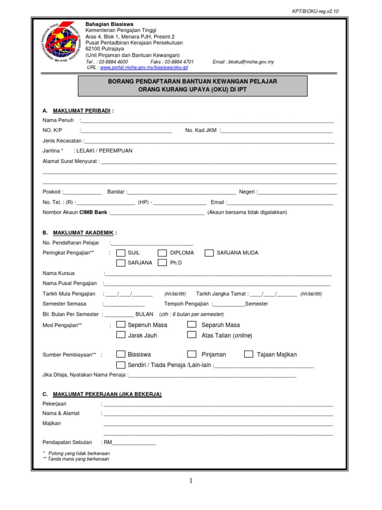 Permohonan Bantuan Kewangan Pelajar Orang Kurang Upaya Oku Di Institusi Pengajian Tinggi Ipt